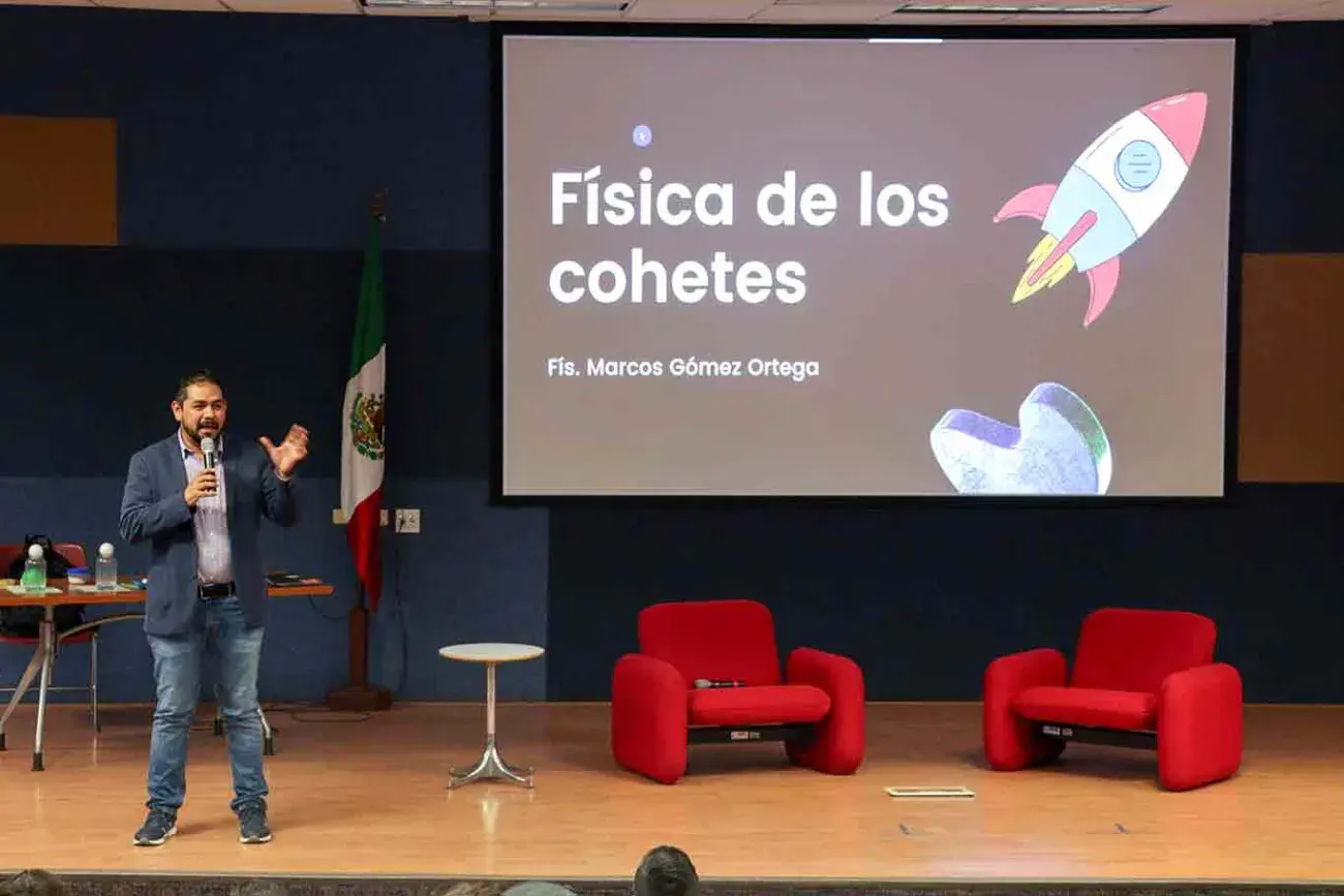 Durante la conferencia “Física de los cohetes”, el físico Marcos Gómez expuso los cálculos requeridos para el lanzamiento de cohetes y destacó que son cruciales para el éxito de las misiones espaciales.